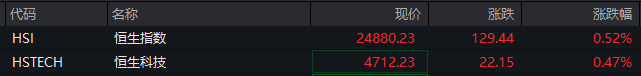 港股方面,恒生指数、恒生科技指数双双上涨,目前涨幅在0.5%左右。