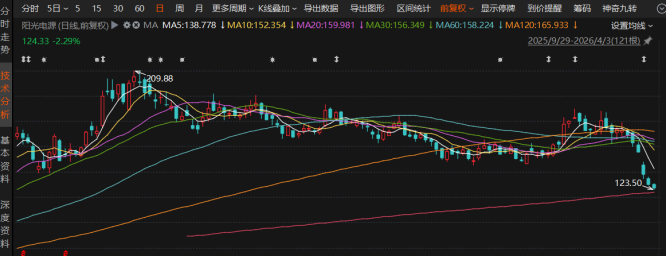 单季业绩暴雷迅速传导至二级市场,阳光电源股价遭遇连续性重挫。4月1日及2日,公司股价接连大跌,跌幅分别为10.82%、5.36%。4月3日保持跌势,截至午间收盘报124.33元/股,跌幅2.29%,总市值2578亿元。今日盘中创下2025年10月以来新低,市值两日半蒸发约548亿元。值得注意的是,此次股价深度调整并非孤立行情,而是自3月27日起下跌态势的延续。截至4月3日午间收盘,公司期间股价累计回撤约42%。