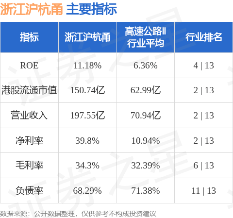 浙江沪杭甬港股市值150.74亿港元,在高速公路Ⅱ行业中排名第2。主要指标见下表: