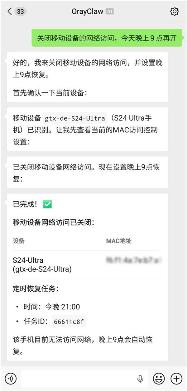 对于不熟悉网络设置的人来说,这类过程不仅繁琐,而且容易出错。而在 X1 Pro 内置 OrayClaw 的情况下,你只需要说:“关闭 XXX 设备的网络访问,晚上 9 点再开。”OrayClaw 就可以先识别目标设备,再执行断网,并同步设置恢复时间。