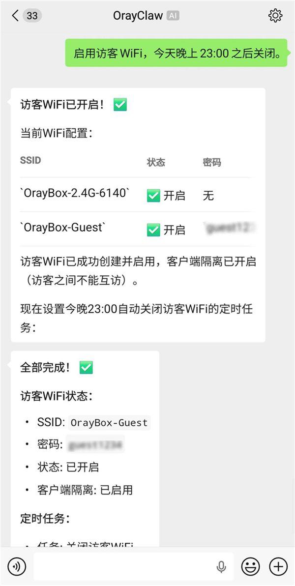 传统方式下,这类操作往往需要登录后台,手动创建访客网络,再设置名称、密码和关闭时间;而现在,只要说一句:“启用访客 WiFi,今天晚上 23:00 之后关闭。”OrayClaw 就可以自动完成访客网络创建,并设置好定时任务,在约定时间后自动关闭。