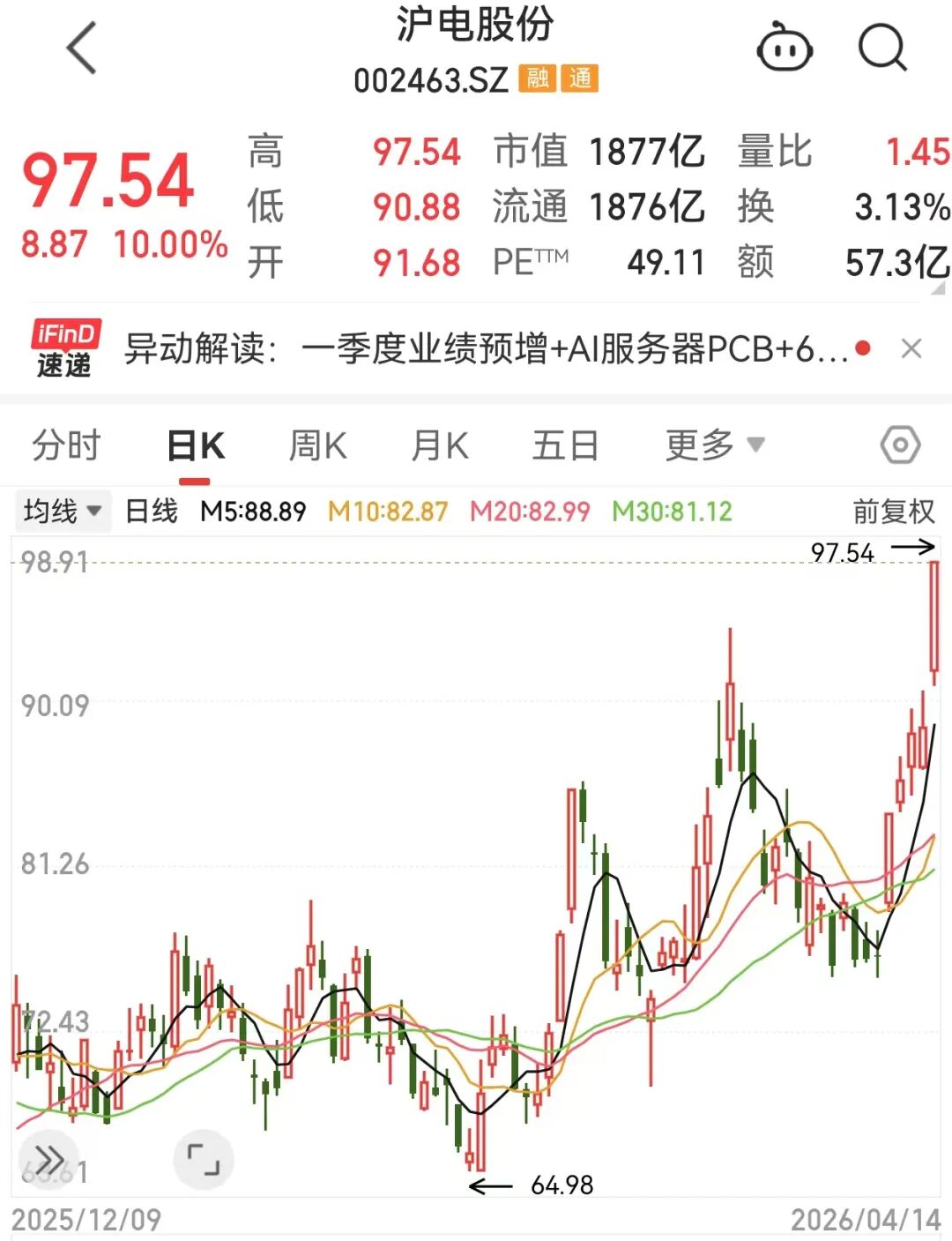 4月14日早盘,沪电股份(002463)股价大幅高开,开盘20分钟内封住涨停板,涨停板封单一度超过20万手,最新股价创历史新高。该公司为PCB龙头,2025年实现净利润38.22亿元,同比增长47.74%。