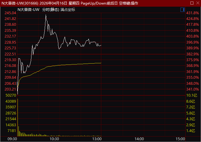 行情数据显示,大普微上午盘中涨幅一度超过430%,股价最高一度至245.04元/股,其发行价为46.08元/股,按照上述盘中最高价计算,中一签大普微最高浮盈约9.95万元,接近10万元。