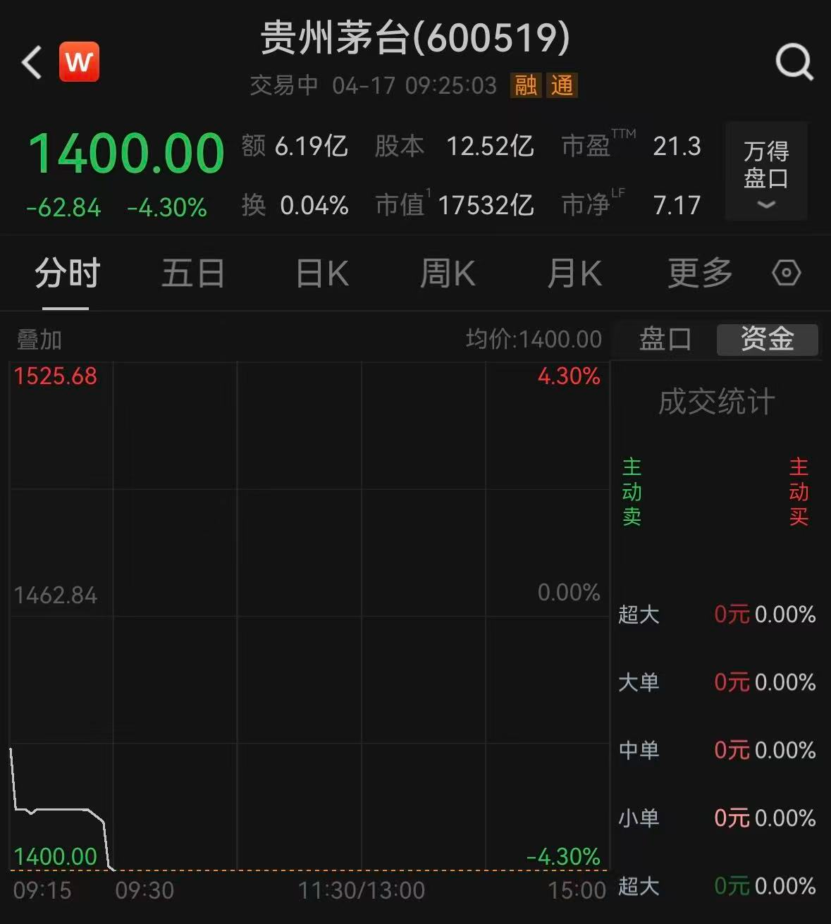 4月17日,贵州茅台(1410.89 -3.55%)开盘跌超4%,报1400元/股。4月16日,贵州茅台发布2025年年度报告,自上市以来业绩首次出现下滑。去年实现营业收入1688.38亿元,同比下降1.21%;归属于上市公司股东的净利润为823.20亿元,同比下降4.53%