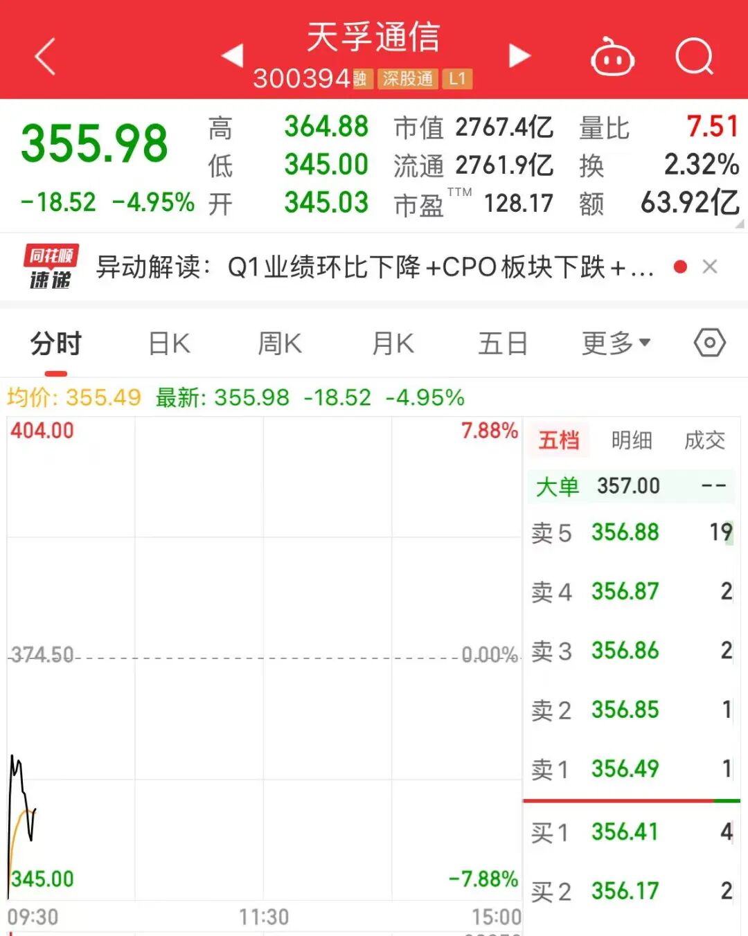 今天早盘,天孚通信低开,截至9:42,下跌4.95%。