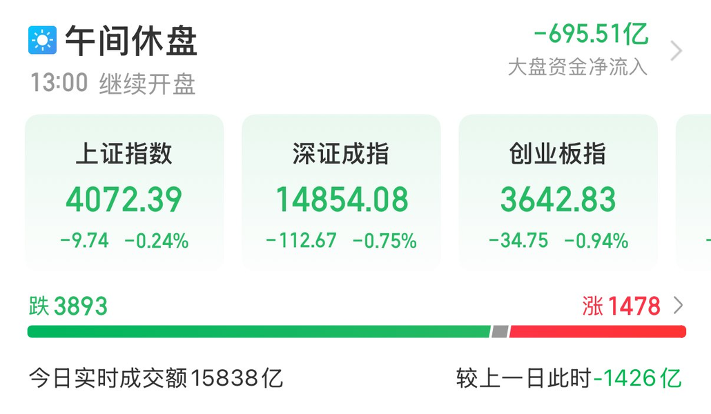 截至午盘,上证指数跌0.24%,深证成指跌0.75%,创业板指跌0.94%,北证50跌1.73%。全市场成交额15837亿元,较上日成交额缩量1425亿元。